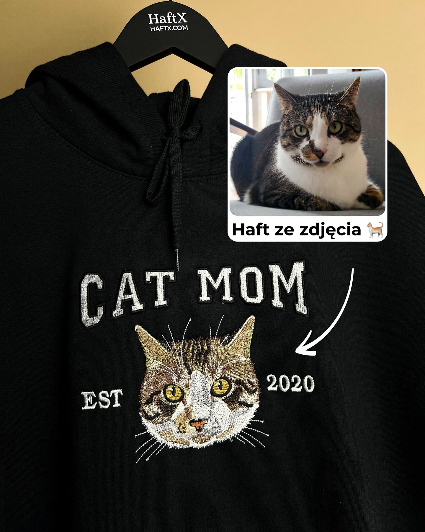 Podaruj sobie lub bliskiej osobie coś naprawdę wyjątkowego! Nasza haftowana bluza lub koszulka z podobizną Twojego pupila i napisem "Cat Dad" lub "Cat Mom" to doskonały sposób na wyrażenie miłości do swojego futrzanego przyjaciela. Wykonana z najwyższej jakości materiałów, zapewnia komfort i trwałość noszenia. Każdy produkt jest indywidualnie haftowany na podstawie przesłanego zdjęcia pupila, co czyni go unikalnym i osobistym prezentem. Starannie wykonany haft oddaje wszystkie detale i cechy charakterystyczne Twojego zwierzaka, tworząc wspaniałą pamiątkę.
