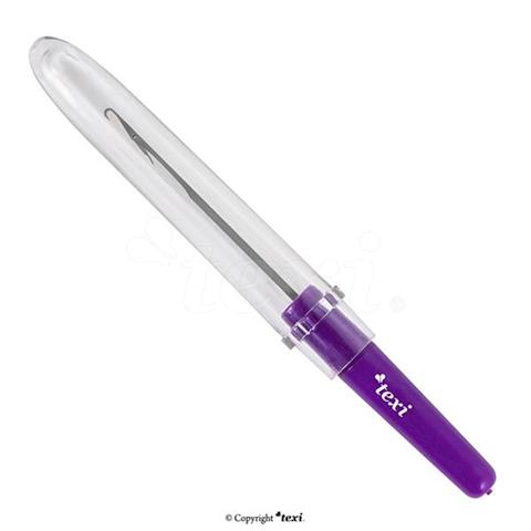 Igła do przeciągania nitek o długości 80 mm, zakończona haczykiem z praktyczną łyżeczką. Niezwykle przydatny przyrząd krawiecki, działający jak szydełko z zamykaną klapką, który ułatwia łapanie i przeciąganie oczek w swetrach oraz dzianinach.