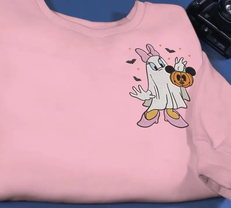 Dodaj odrobinę halloweenowej magii i uroku do swojej garderoby dzięki wzorowi „Halloweenowa Daisie”! Ta bluza lub koszulka przedstawia Daisię w upiornym kostiumie ducha, który przyciąga wzrok i wprowadza humorystyczny akcent na nadchodzące święto duchów. Subtelny haft został wykonany z dbałością o szczegóły, co sprawia, że postać Daisie wygląda niezwykle uroczo i nietypowo.