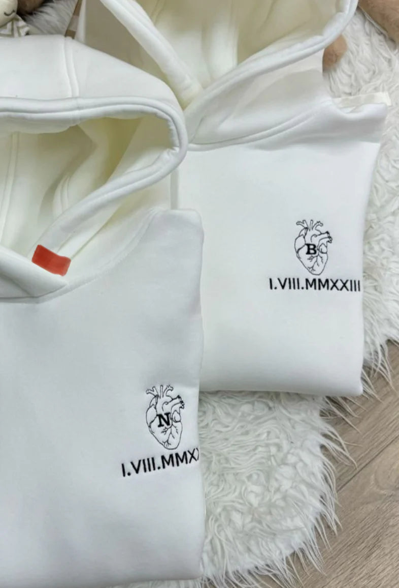 Personalizowana Bluza/Koszulka (unisex) z haftem anatomicznego serca, Twojej daty w stylu rzymskim i inicjałów