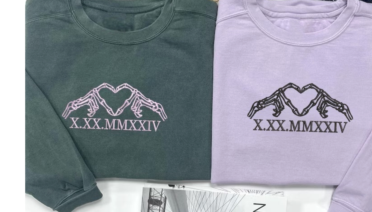 Personalizowana Bluza/Koszulka (unisex) z haftem szkieletowych dłoni w sercu i Twojej daty rzymskiej