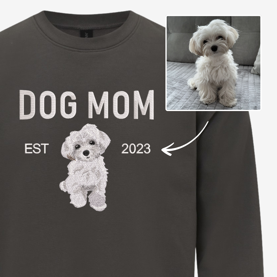 Personalizowana Bluza/Koszulka (unisex) z haftem ze zdjęcia pupila – cała sylwetka z tekstem «DOG MOM»